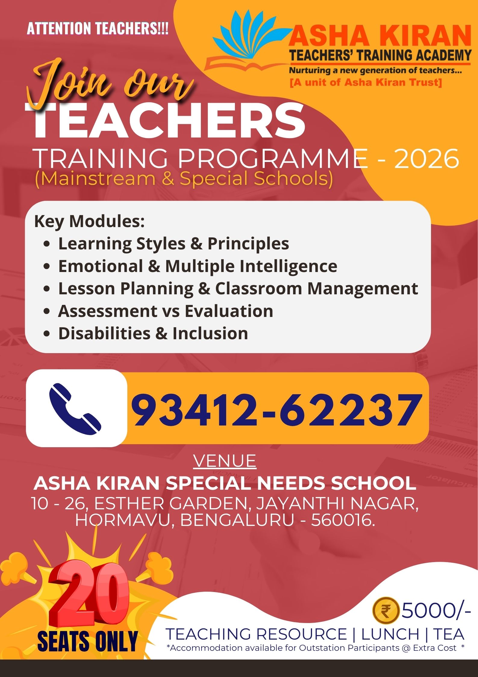 Asha Kiran, a beacon of hope and empowerment for children with unique abilities. We provide exceptional education and comprehensive assistance to children with Autism, Specific Learning Difficulties, ADHD, Hearing Impairment, Intellectual Challenges, and Cerebral Palsy, as well as support disadvantaged children from economically underprivileged backgrounds.